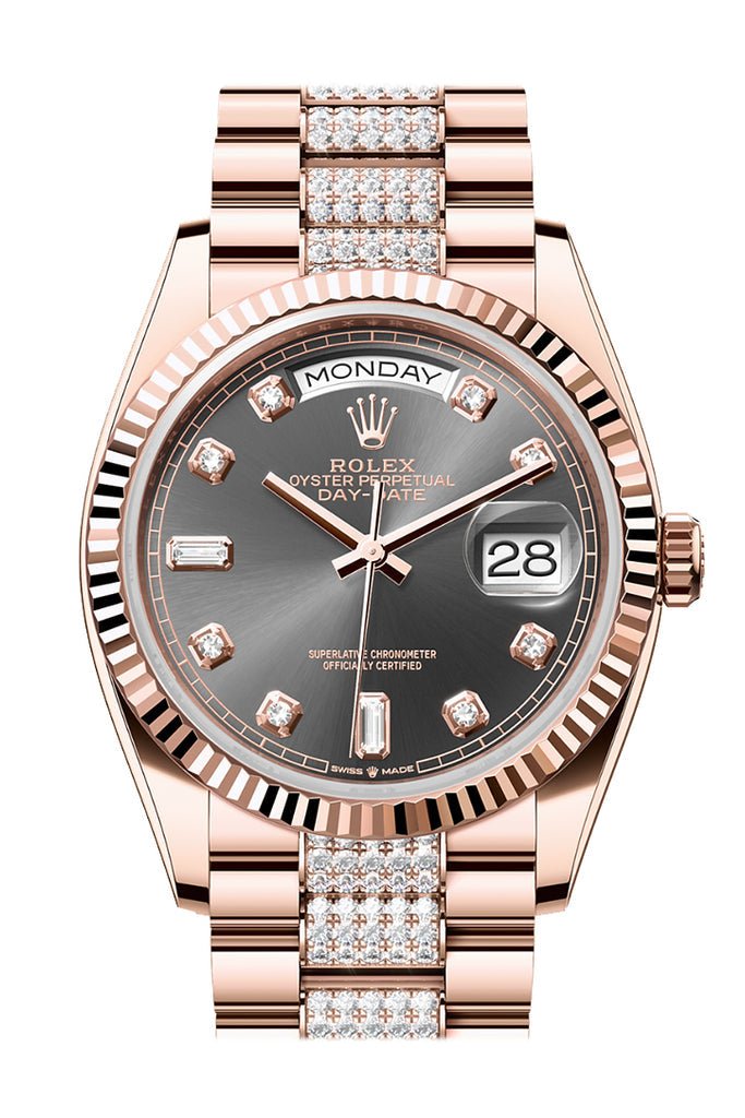 Immerse yourself in the realm of luxury and precision with the Rolex Day-Date 36 Slate Diamond Dial Fluted Bezel 18K Everose Gold Diamond President Watch 128235. It’s more than a watch; it’s a statement of unparalleled craftsmanship, sophistication, and timeless elegance.