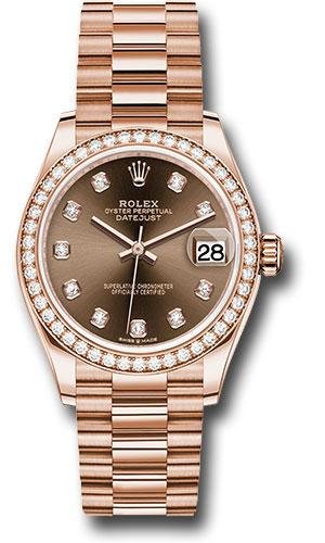 31mm 18K Everose gold case, screw-down crown with twinlock double waterproofness system, bezel set with 46 diamonds, scratch-resistant sapphire crystal with cyclops lens over the date, chocolate dial, diamond hour markers, Rolex calibre 2236 automatic movement with center hour, minute and seconds hands, instantaneous date with rapid setting, and stop-seconds for precise time setting, approximately 55 hours of power reserve, 18K Everose gold President bracelet with semi-circular three-piece links, concealed folding Crownclasp buckle. Waterproof to 100 meters. Baselworld 2019 release.