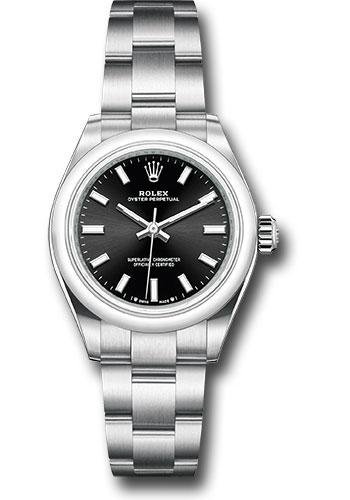 28mm Oystersteel case, screw-down crown with twinlock double waterproofness system, domed bezel, scratch-resistant sapphire crystal, bright black dial, index hour markers, Rolex calibre 2232 automatic movement with center hour, minute and seconds hands, and stop-seconds for precise time setting, approximately 55 hours of power reserve, Oyster bracelet with flat three-piece links, folding Oysterclasp buckle with Easylink 5mm comfort extension link. Waterproof to 100 meters.