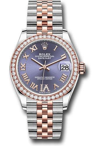 31mm Everose Rolesor case comprised of Oystersteel and 18K Everose gold, screw-down back, screw-down crown with twinlock double waterproofness system, 18K Everose gold bezel set with 46 diamonds, scratch-resistant sapphire crystal with cyclops lens over the date, aubergine dial, Roman numerals with diamond set 6, Rolex calibre 2236 perpetual self-winding movement with date at 3 o’clock, approximately 55 hours of power reserve, Everose Rolesor Jubilee bracelet with semi-circular three-piece links, concealed folding Crownclasp buckle. Waterproof to 100 meters. Baselworld 2019 release.