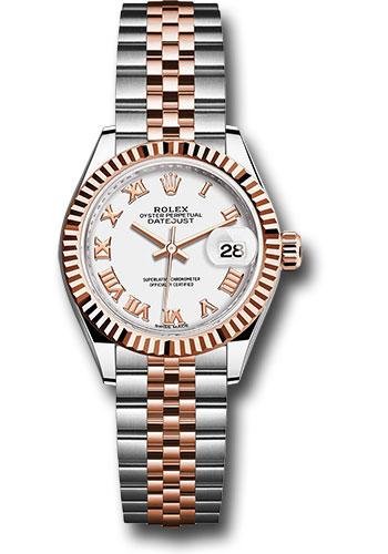 28mm Everose Rolesor case comprised of a 904L steel monobloc middle case, screw-down steel back, 18K Everose gold screw-down crown with twinlock double waterproofness system, 18K Everose gold fluted bezel, scratch-resistant sapphire crystal with cyclops lens over the date and double anti-reflective coating, white dial, Roman numerals, Rolex calibre 2236 automatic movement with center hour, minute and seconds hands, instantaneous date with rapid setting, and stop-seconds for precise time setting, Everose Rolesor Jubilee bracelet comprised of a combination of 904L steel and 18K Everose gold in five-piece links, concealed folding Crownclasp buckle. Waterproof to 100 meters.