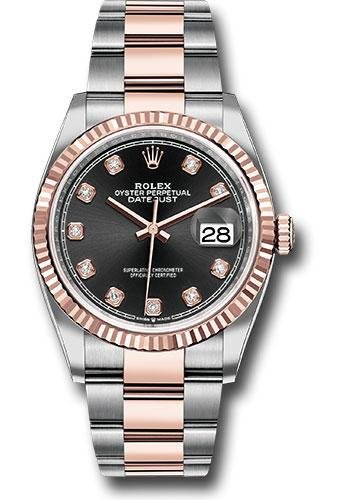 36mm Everose Rolesor case with Oystersteel monobloc middle case, screw-down steel back, screw-down 18K Everose crown, 18K Everose fluted bezel, black dial, 10 diamond hour markers, Rolex calibre 3235 self-winding movement with date at 3 o’clock, approximately 70 hours of power reserve, Everose Rolesor Oyster bracelet with flat three-piece links, folding Oysterclasp buckle with Easylink 5mm comfort extension link. Waterproof to 100 meters. Redesigned for Baselworld 2018 with updated case sides, lugs, and calibre 3235 movement.