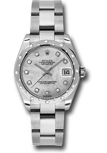 31mm stainless steel case, 18k white gold domed bezel set with 24 diamonds, mother of pearl dial, diamond hour markers, and Oyster bracelet.