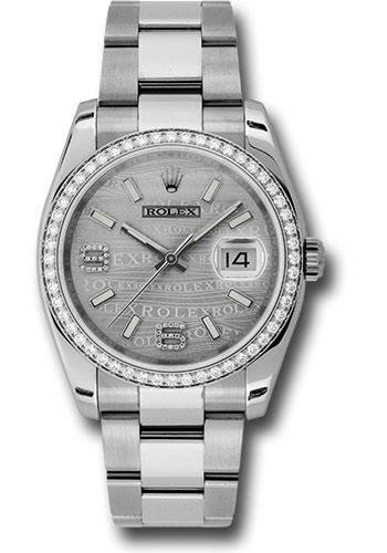 36mm stainless steel case, 18K white gold bezel set with 52 brilliant-cut diamonds, silver wave dial, diamond set 6 and 9 Arabic numerals, and stainless steel Oyster bracelet.