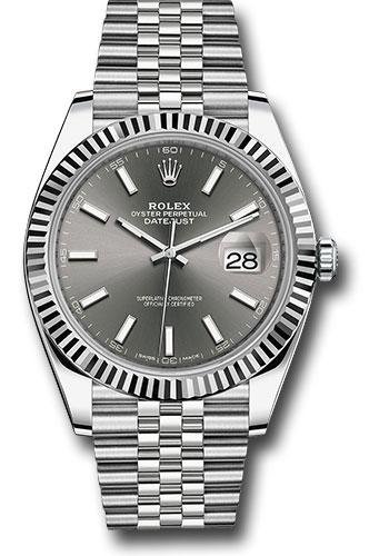 41mm white Rolesor case comprised of a 904L steel monobloc middle case, screw-down steel back, screw-down crown with twinlock double waterproofness system, 18K white gold fluted bezel, scratch-resistant double anti-reflective sapphire crystal with cyclops lens over the date, dark rhodium dial, index hour markers, Rolex calibre 3235 perpetual self-winding movement with date at 3 o’clock that changes instantaneously at midnight in a few thousandths of a second, approximately 70 hours of power reserve, 904L steel Jubilee bracelet with five-piece links, folding Oysterclasp buckle with Easylink 5mm comfort extension link. Waterproof to 100 meters.