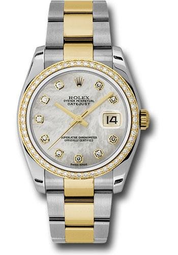 36mm stainless steel case, 18K yellow gold bezel set with 52 brilliant-cut diamonds, mother of pearl dial, diamond hour markers, and stainless steel and 18K yellow Oyster bracelet.