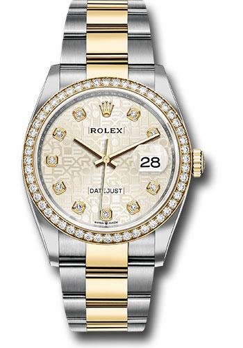 36mm yellow Rolesor case with Oystersteel monobloc middle case, screw-down steel back, screw-down 18K yellow crown, 18K yellow diamond bezel, silver Jubilee dial, 10 diamond hour markers, Rolex calibre 3235 self-winding movement with date at 3 o’clock, approximately 70 hours of power reserve, yellow Rolesor Oyster bracelet with flat three-piece links, folding Oysterclasp buckle with Easylink 5mm comfort extension link. Waterproof to 100 meters. Redesigned for Baselworld 2018 with updated case sides, lugs, and calibre 3235 movement.