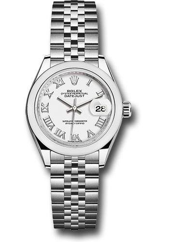 28mm 904L stainless steel case, screw-down steel back, screw-down crown with twinlock double waterproofness system, steel domed bezel, scratch-resistant sapphire crystal with cyclops lens over the date and double anti-reflective coating, white dial, Roman numerals, Rolex calibre 2236 automatic movement with center hour, minute and seconds hands, instantaneous date with rapid setting, and stop-seconds for precise time setting, stainless steel Jubilee bracelet with five-piece links, concealed folding Crownclasp buckle. Waterproof to 100 meters.