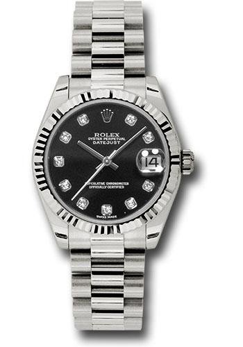 31mm 18K white gold case, screw-down crown with twinlock double waterproofness system, fluted bezel, scratch-resistant sapphire crystal with cyclops lens over the date, black dial, 10 diamond hour markers, Rolex calibre 2235 automatic movement, President bracelet with semi-circular three-piece links, concealed folding Crownclasp buckle. Waterproof to 100 meters.