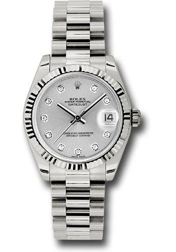 31mm 18K white gold case, screw-down crown with twinlock double waterproofness system, fluted bezel, scratch-resistant sapphire crystal with cyclops lens over the date, silver dial, 10 diamond hour markers, Rolex calibre 2235 automatic movement, President bracelet with semi-circular three-piece links, concealed folding Crownclasp buckle. Waterproof to 100 meters.