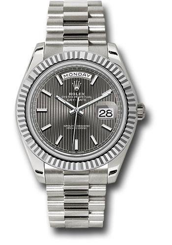 40mm 18K white gold case, screw-down back with Rolex fluting, screw-down crown with twinlock double waterproofness system, fluted bezel, scratch-resistant double anti-reflective sapphire crystal with cyclops lens over the date, dark rhodium stripe motif dial, index hour markers with Chromalight, Rolex calibre 3255 automatic movement with centre hour, minute and seconds hands, instantaneous day and date in apertures, unrestricted rapid-setting, and stop-seconds for precise time setting, approximately 70 hours of power reserve, President bracelet with three-piece solid links comprised of a polished center link, satin-finished outer links, and ceramic inserts, concealed folding Crownclasp buckle. Waterproof to 100 meters.