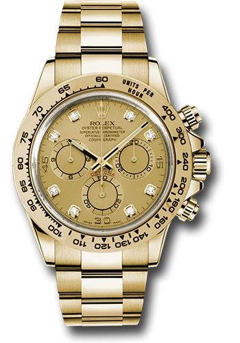 40mm 18K yellow gold case, screw-down back, screw-down crown and push buttons with Triplock triple waterproofness, fixed 18K yellow gold bezel with engraved tachymetric scale, scratch-resistant sapphire crystal, champagne dial, diamond hour markers, Rolex calibre 4130 self-winding movement with chronograph central second hand, 30-minute counter at 3 o’clock, and 12-hour counter at 9 o’clock, approximately 72 hours of power reserve, 18K yellow gold Oyster bracelet with flat three-piece links, folding Oysterlock buckle with Easylink 5mm comfort extension link. Waterproof to 100 meters.