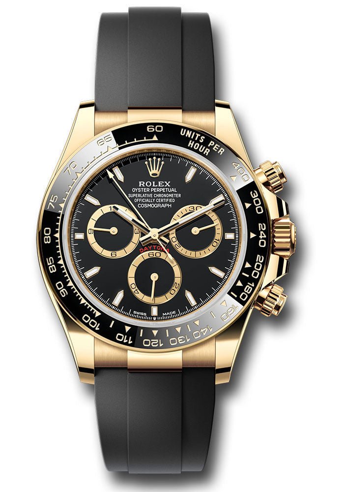 40mm 18K yellow gold case, screw-down back, screw-down crown with triplock triple waterproofness system, black monobloc cerachrom bezel in ceramic with moulded tachymetric scale, scratch-resistant sapphire crystal scratch-resistant sapphire, black dial, index hour markers, 4131, manufacture Rolex perpetual, mechanical chronograph, self-winding movement with centre hour and minute hands, small seconds hand at 6 o’clock, chronograph via centre seconds hand, 30-minute counter at 3 o’clock and 12-hour counter at 9 o’clock, stop seconds for exact time setting, approximately 72 hours of power reserve, Oysterflex strap made from flexible metal blades overmoulded with high-performance elastomer, folding Oysterlock safety buckle with rolex glidelock extension system. Waterproof to 100 metres / 330 feet.