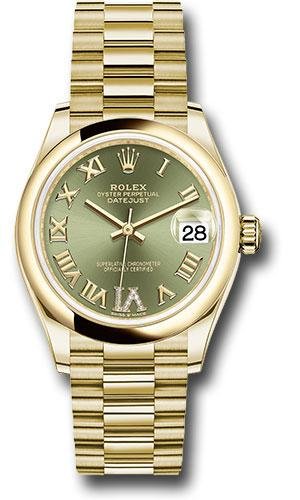 31mm 18K yellow gold case, screw-down crown with twinlock double waterproofness system, domed bezel, scratch-resistant sapphire crystal with cyclops lens over the date, olive green diamond Roman IV dial, Roman numerals with 11 diamonds set on VI, Rolex calibre 2236 automatic movement with center hour, minute and seconds hands, instantaneous date with rapid setting, and stop-seconds for precise time setting, approximately 55 hours of power reserve, 18K yellow gold President bracelet with semi-circular three-piece links, concealed folding Crownclasp buckle. Waterproof to 100 meters.