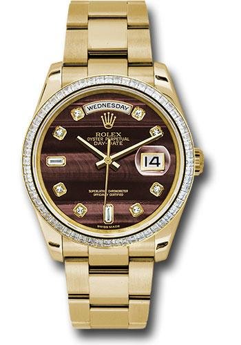 36mm 18K yellow gold case, bezel set with 60 baguette diamonds, bulls eye dial, 8 round and 2 baguette diamond hour markers, and Oyster bracelet.