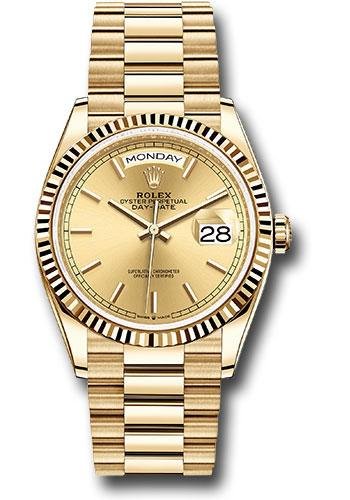 36mm 18K yellow gold case, screw-down back, screw-down crown with twinlock double waterproofness system, fluted bezel, scratch-resistant sapphire crystal with cyclops lens over the date, champagne dial, index hour markers, Rolex calibre 3255 perpetual self-winding movement with centre hour, minute and seconds hands, instantaneous day and date in apertures, unrestricted rapid-setting, and stop-seconds for precise time setting, approximately 70 hours of power reserve, 18K yellow gold President bracelet with semi-circular three-piece links, concealed folding Crownclasp buckle. Waterproof to 100 meters. Baselworld 2019 release.