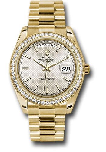 40mm 18K yellow gold case, screw-down back with Rolex fluting, screw-down crown with twinlock double waterproofness system, bezel set with 48 diamonds, scratch-resistant double anti-reflective sapphire crystal with cyclops lens over the date, silver diagonal motif dial, index hour markers with Chromalight, Rolex calibre 3255 automatic movement with centre hour, minute and seconds hands, instantaneous day and date in apertures, unrestricted rapid-setting, and stop-seconds for precise time setting, approximately 70 hours of power reserve, President bracelet with three-piece solid links comprised of a polished center link, satin-finished outer links, and ceramic inserts, concealed folding Crownclasp buckle. Waterproof to 100 meters.