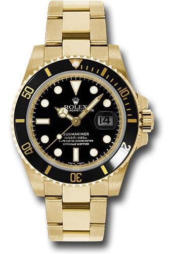 40mm 18K yellow gold case, black time lapse Cerachrom bezel, black dial, and Oyster Glidelock bracelet. Water resistant to 1000 feet.