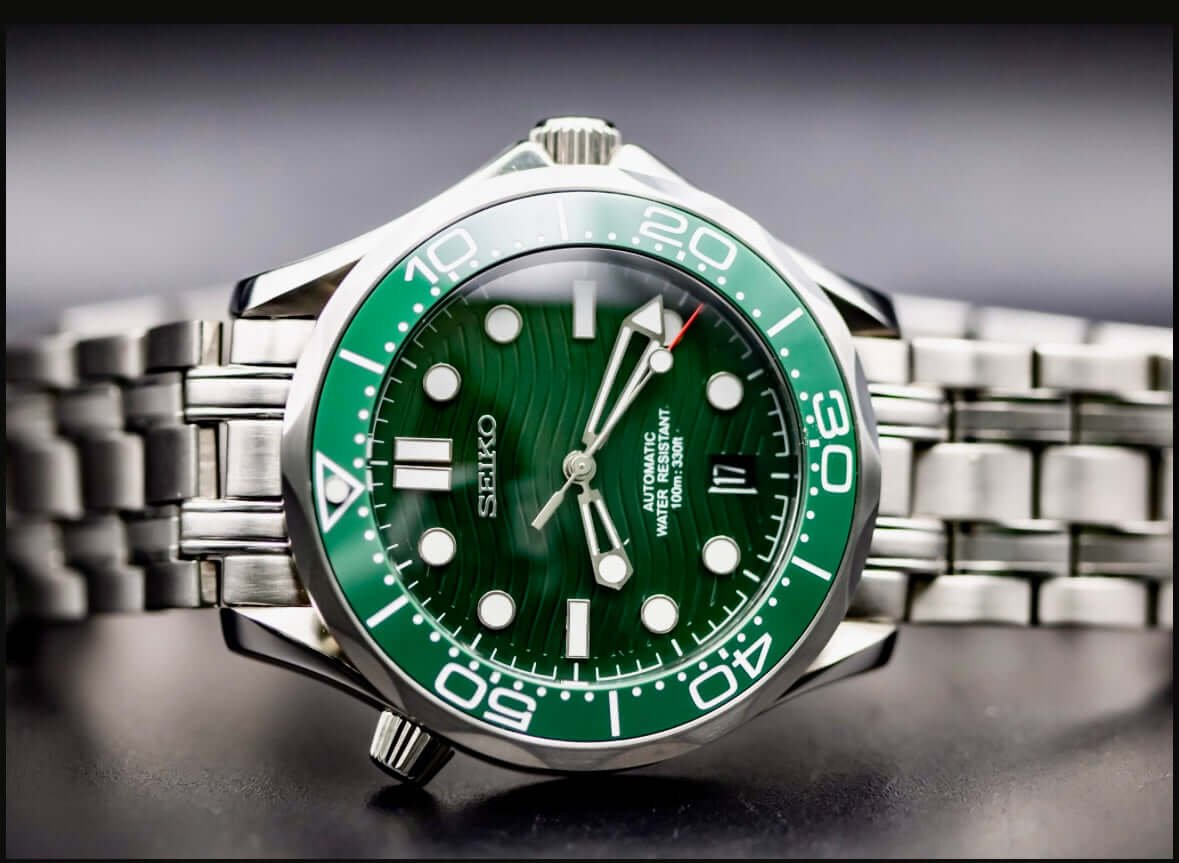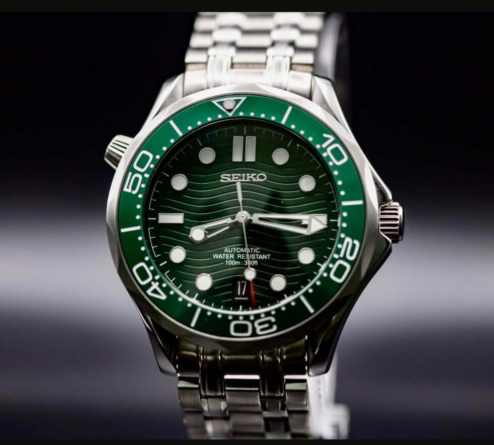 Elevate your style with the Seiko Mod Green Seamaster watch, a custom Seiko NH35 Automatic Watch, inspired by the iconic Seamaster design. This unique timepiece features a Green dial, Green bezel encased in a 40mm stainless steel frame, offering a blend of elegance and precision for watch enthusiasts.