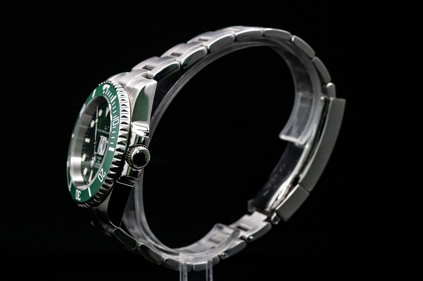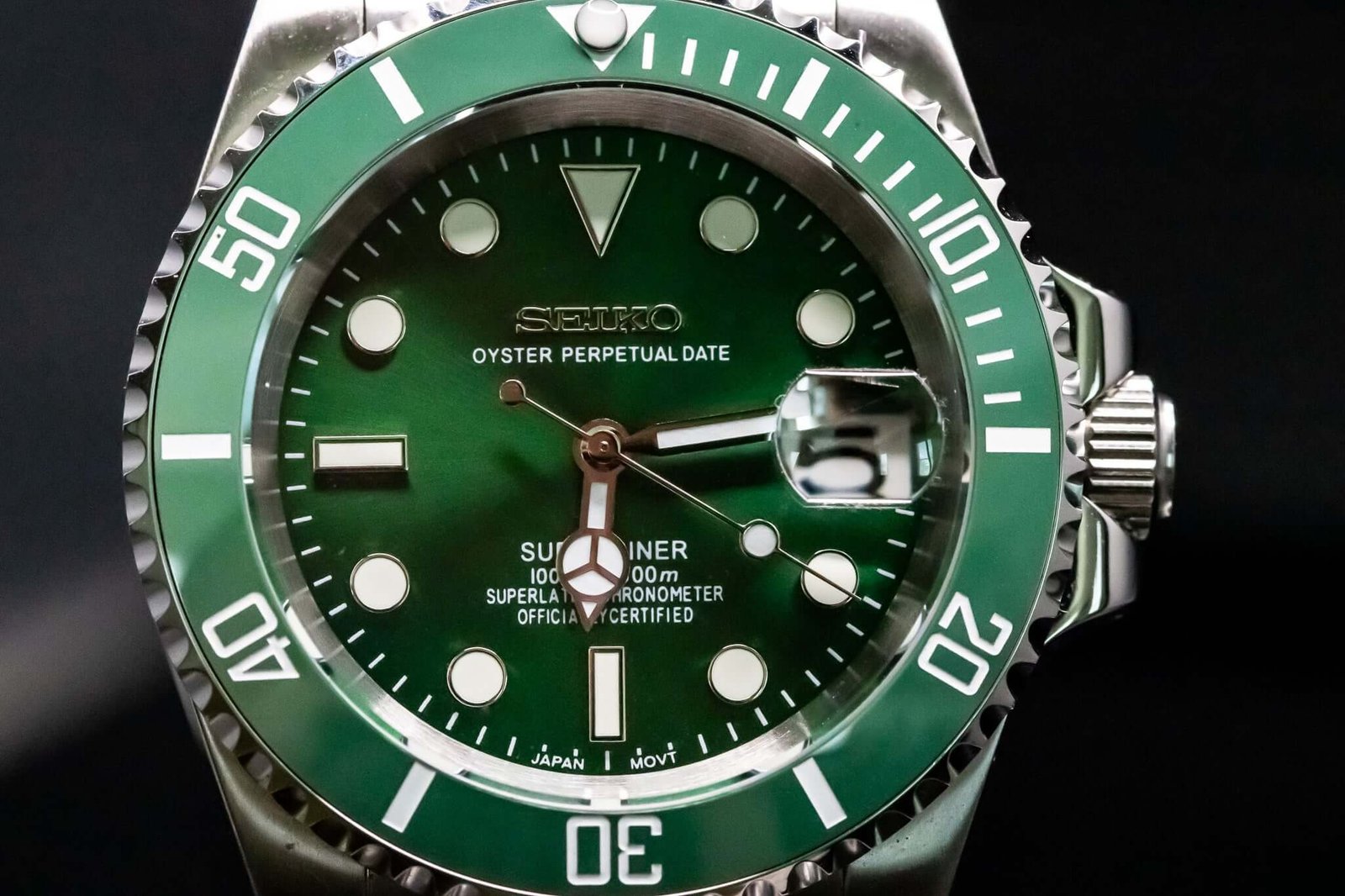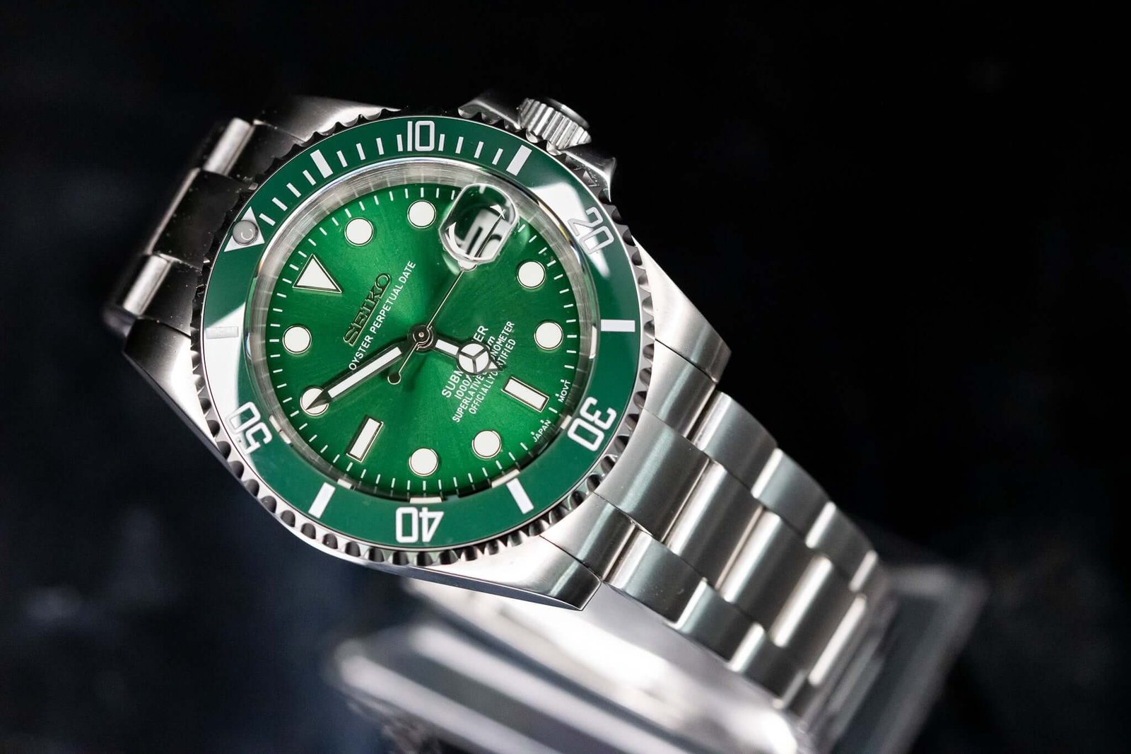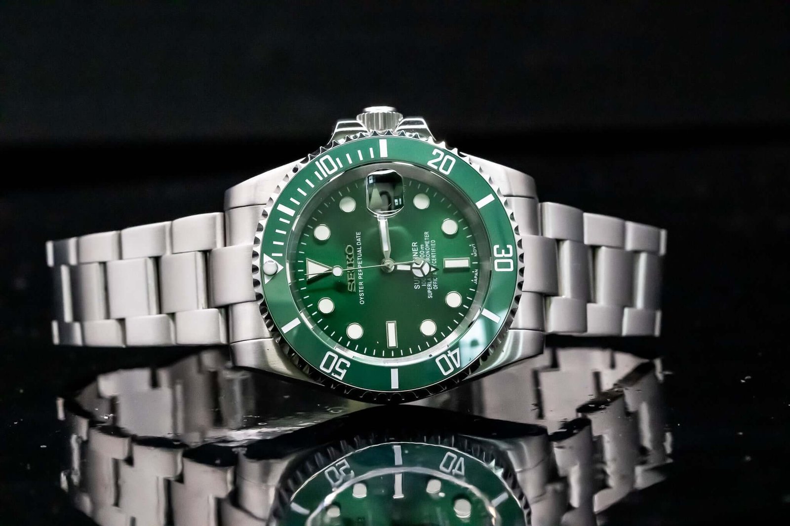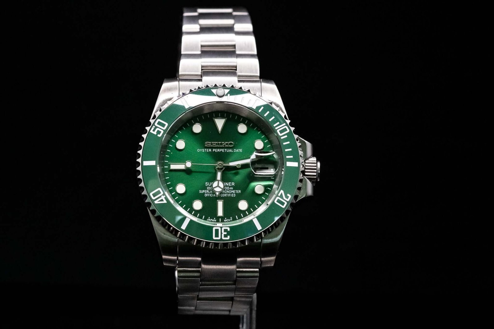 Introducing the Seiko Mod Hulk Diver, a stunning Submariner homage watch that is a perfect combination of sporty and sophisticated. With its striking green dial, this watch is sure to make a bold statement on any wrist. This timepiece is perfect for those who want to stand out and make a lasting impression.