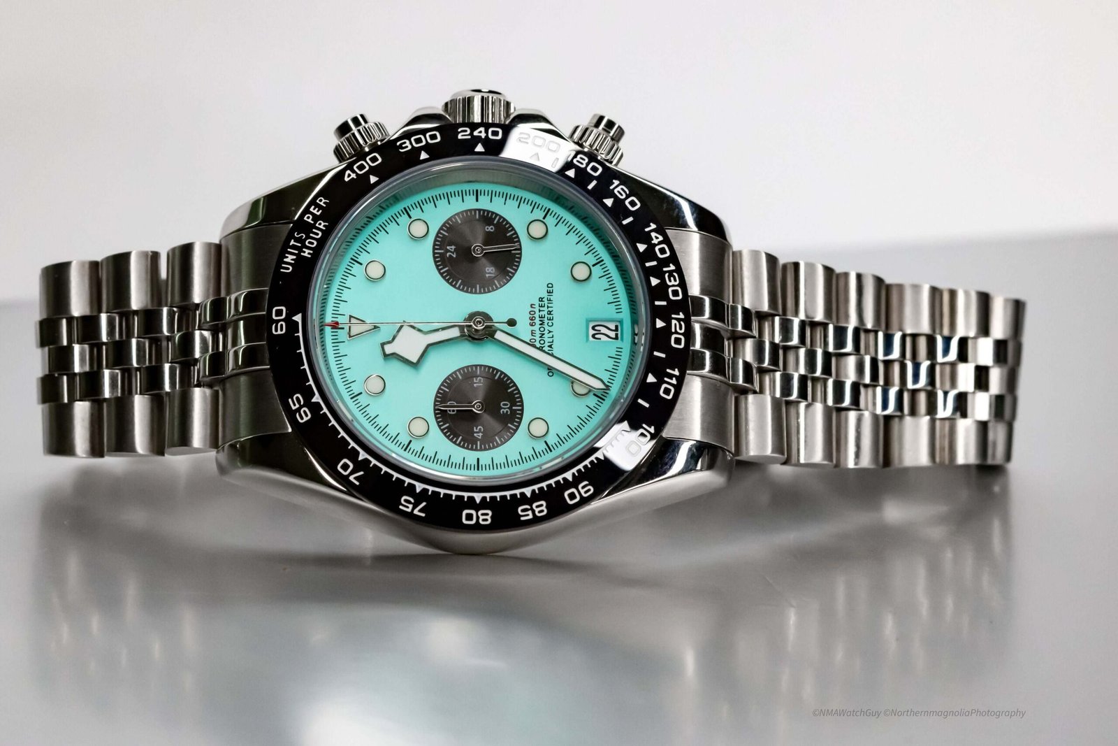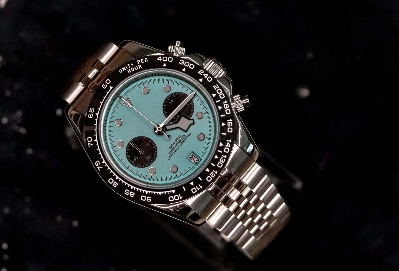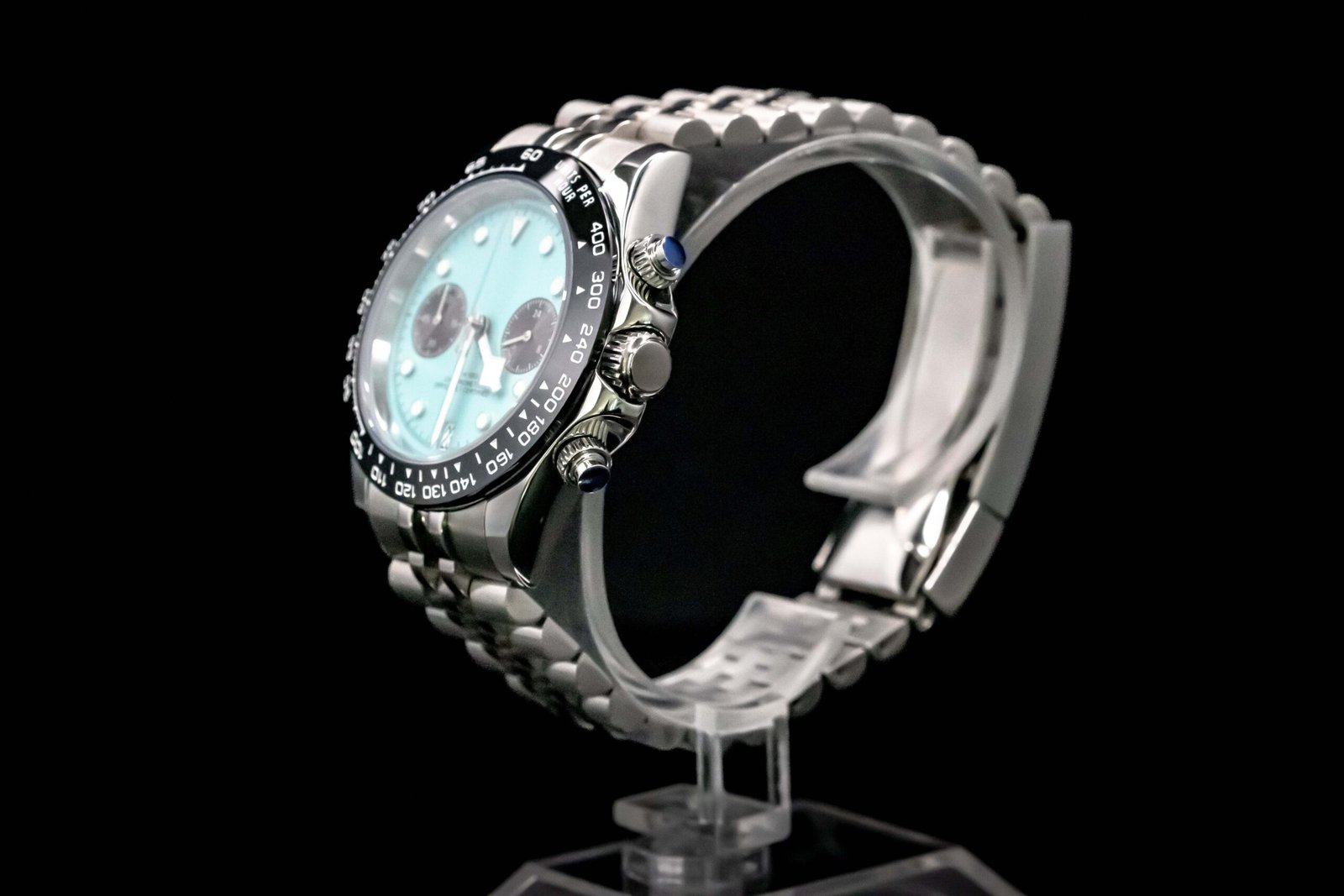Introducing the baby blue Black Bay Chrono Homage – a classy and sporty timepiece that seamlessly combines elegance and functionality. This stunning watch is perfect for those who appreciate a bold statement piece that doesn’t break the bank. The sleek black bezel and baby blue dial make for a truly unique and eye-catching design, while the chronograph feature adds a practical element for everyday wear. Whether you’re dressing up for a special occasion or heading to the gym, the Black Bay Chrono Homage is the perfect accessory to elevate your look. Get ready to turn heads with this affordable and stylish watch from our collection.