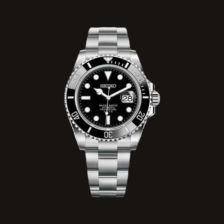 Introducing the Submariner Black, a custom Seiko NH35 Automatic Watch inspired by the iconic Submariner, meticulously crafted for watch enthusiasts seeking uniqueness and precision. This mode features a Black dial and a transparent back piece, allowing a glimpse into the intricate automatic movement.