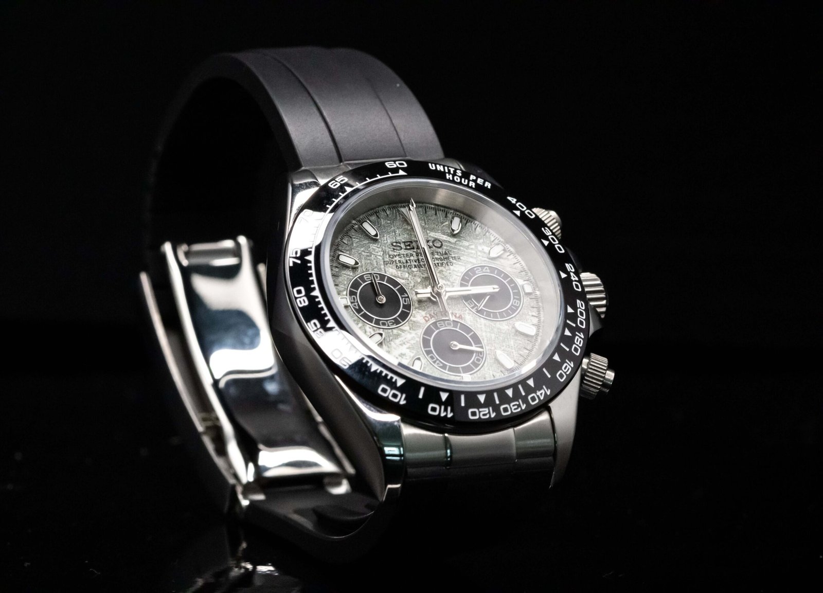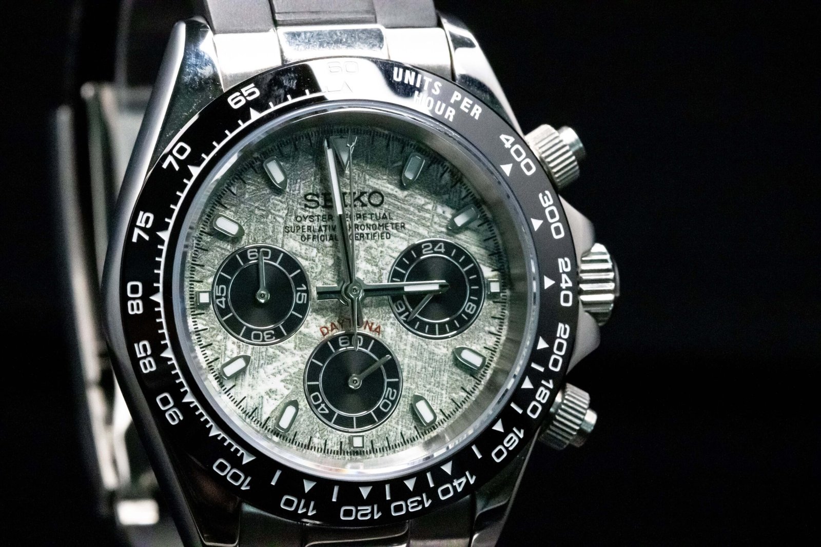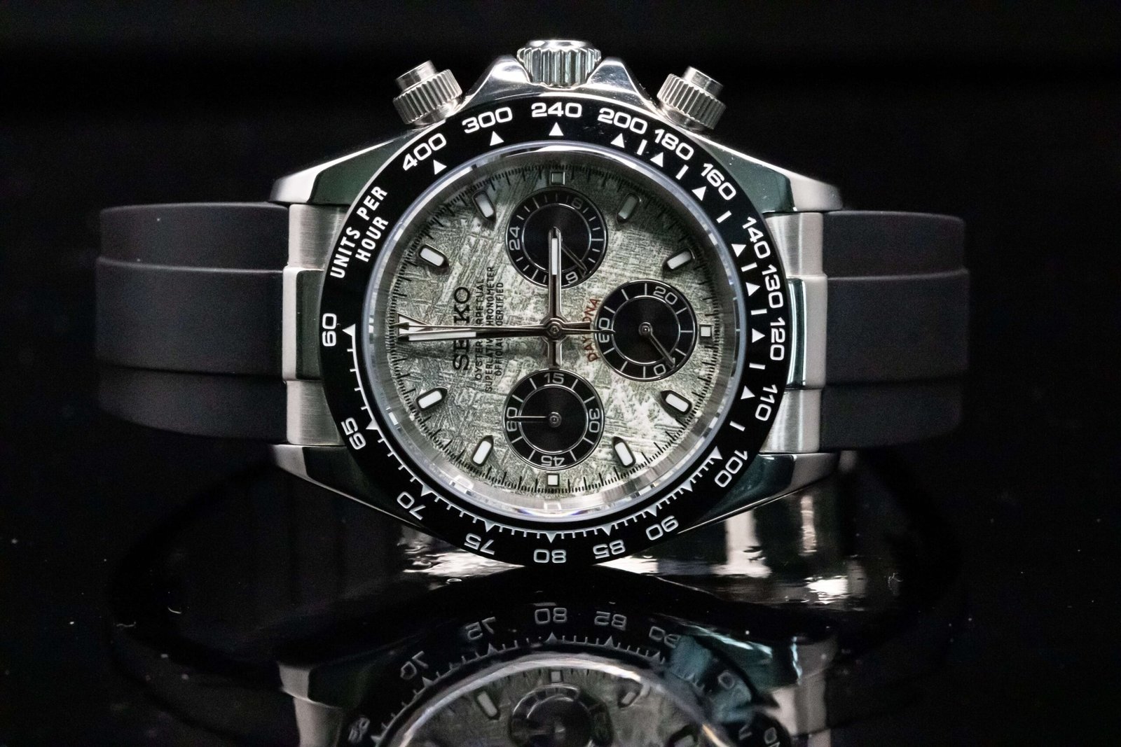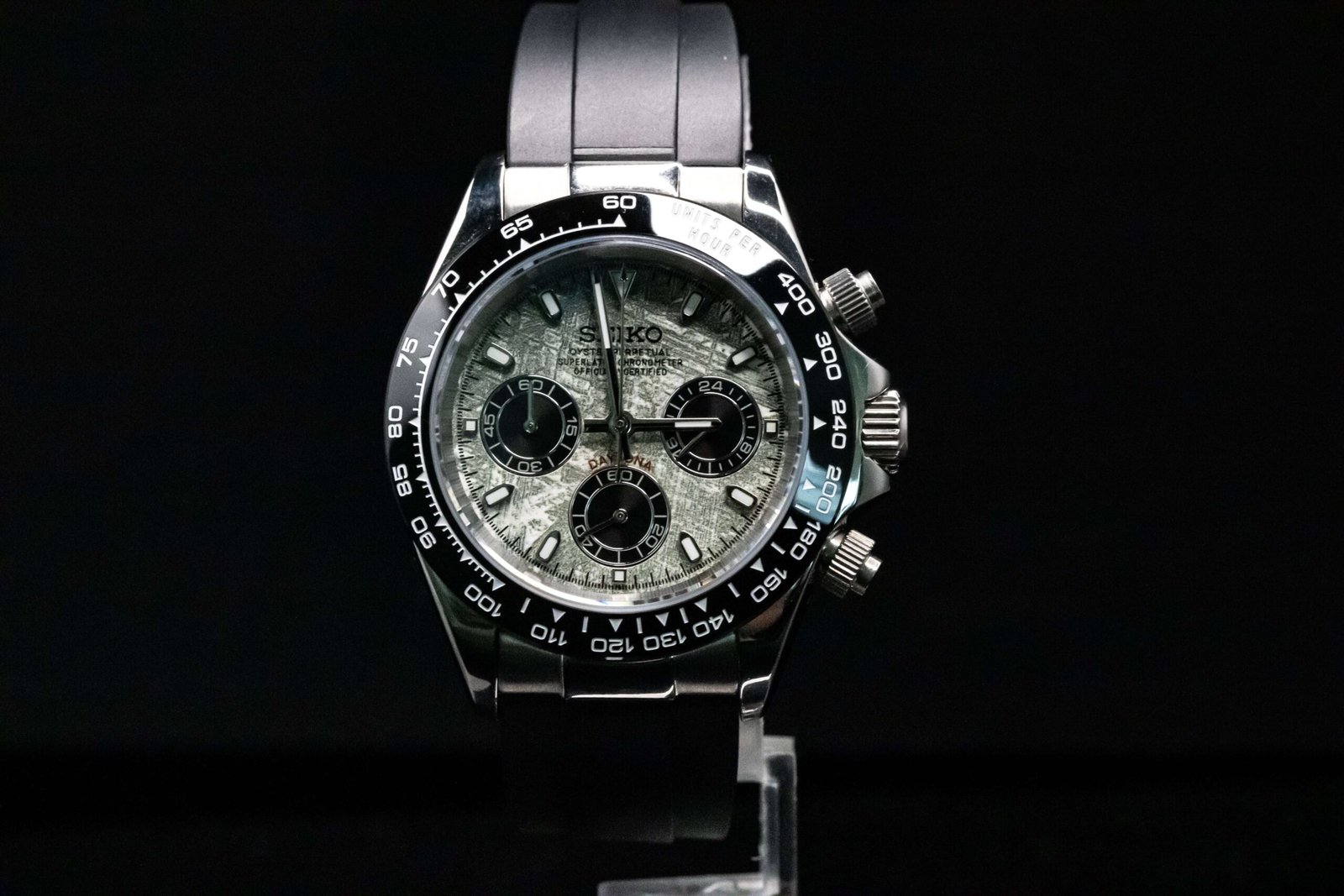 This Seikomod Meteorite Chronograph is a masterfully crafted watch. A timepiece that speaks of a true watch connoisseur, masterfully hand-made by our professional watchmakers, to be the perfect all-rounder daily wear, without failing to turn heads with its legendary case and diver’s look.