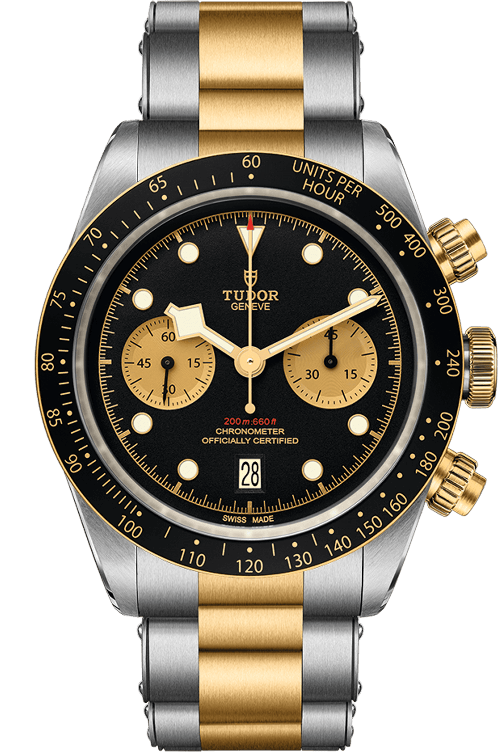 The Black Bay Chrono is the first chronograph in the TUDOR family. Fitted with the Manufacture Caliber MT5813, this powerful style conveys the essence of Black Bay design through hallmark characteristics including angular Snowflake hands and an unprotected gold winding crown. This model is rendered in steel with a fixed yellow gold bezel for a modern yet elegant touch. Gold marking and accents make a statement on its black, domed dial.