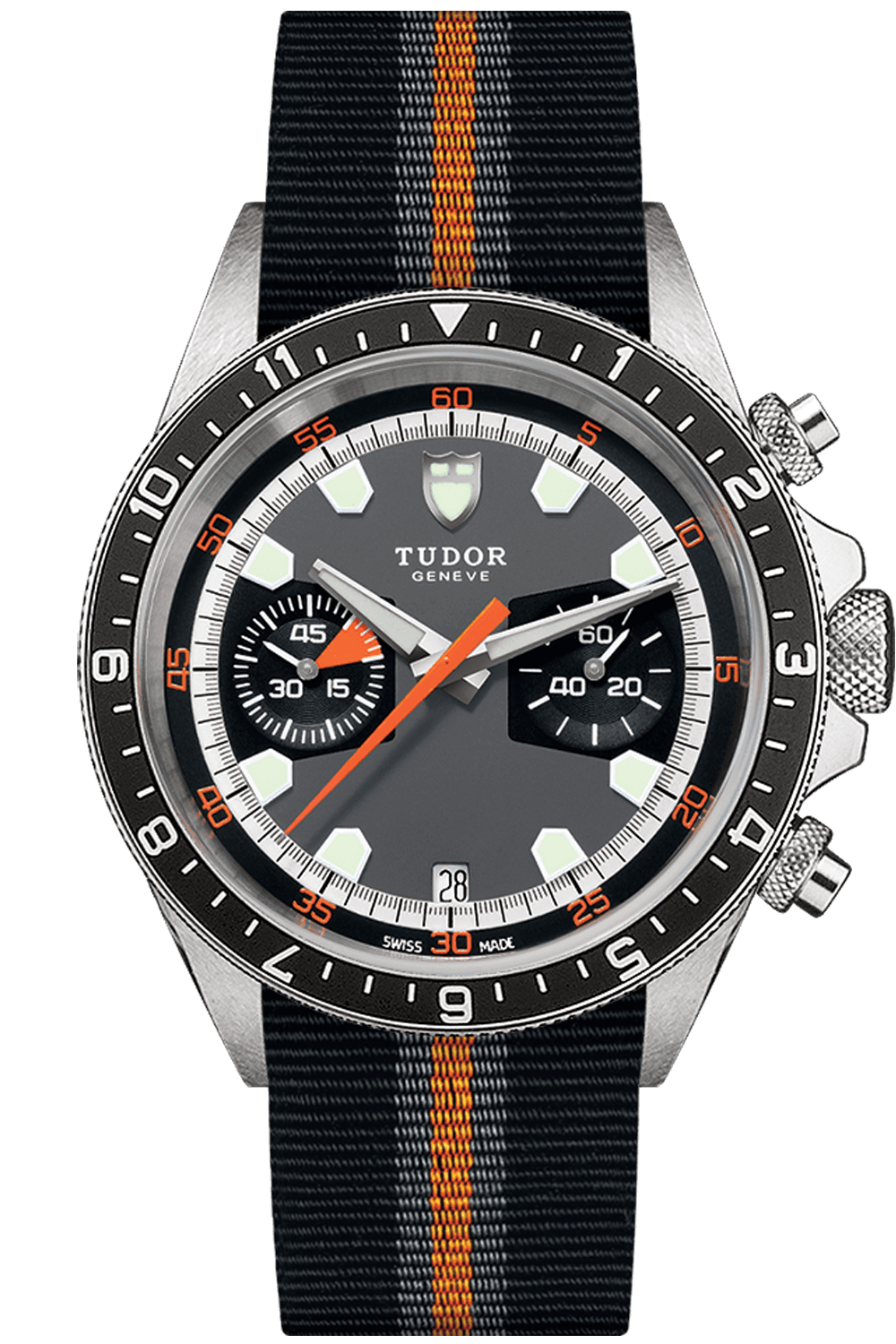 The Heritage Chrono demonstrates the original shape and proportions of the TUDOR Oysterdate Chronograph from the early 1970s. Updated with modern design details, this model features a gray and black dial with a fabric strap. Impressive functionality such as a dual time zone display, rotatable 12-hour graduated steel bezel and 45-minute totalizer ensure ultimate precision.