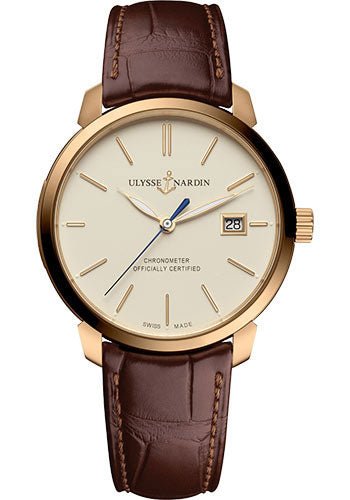 40 mm 18K rose gold case, sapphire crystal, eggshell dial, Caliber UN-815 self-winding movement with COSC certificate, date, leather strap, pin buckle. Water resistant to 50m.