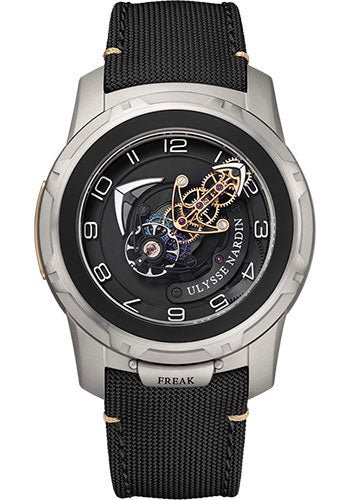 45mm titanium and steel case, transparent back, sapphire crystal, black dial with gold gear train, Caliber UN-205 manual-winding movement with hour and minutes indicated by the rotation of the movement, winding by rotating the back bezel, and time set with the front bezel, approximately 7 days of power reserve, black sailcloth strap with gold bar tack loop stitches, folding buckle. Water resistant to 30m.