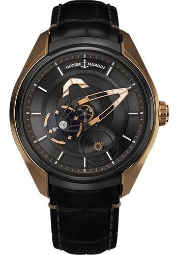 43 mm rose gold 5n and titanium with black dlc finish case, Caliber UN-230 self-winding movement, alligator strap. Water resistant to 50m.