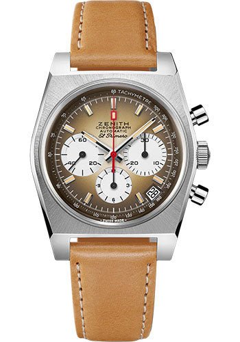 37 mm steel case, gradient brown dial, El Primero movement with chronograph, approximately 50 hours of power reserve, light brown calfskin leather strap, stainless steel pin buckle buckle. Water resistant to 5 ATM.