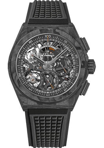 44 mm black carbon case, openworked dial, El Primero 9004 automatic movement with 1/100th of a second chronograph, approximately 50 hours of power reserve, black rubber strap with black rubber cordura effect and grey stitchings, titanium double folding buckle with black carbon head. Water resistant to 10 ATM.