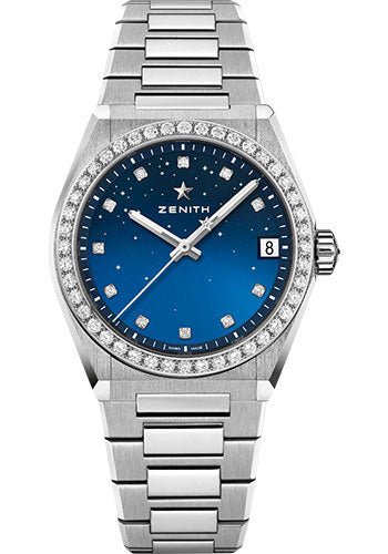 36 mm stainless steel case, diamond-set bezel, gradient blue dial, Elite 670 automatic movement with hours and minutes in the centredate indication at 3 o’clock, central seconds hand, approximately 50 hours of power reserve, metal bracelet. Water resistant to 10 ATM.